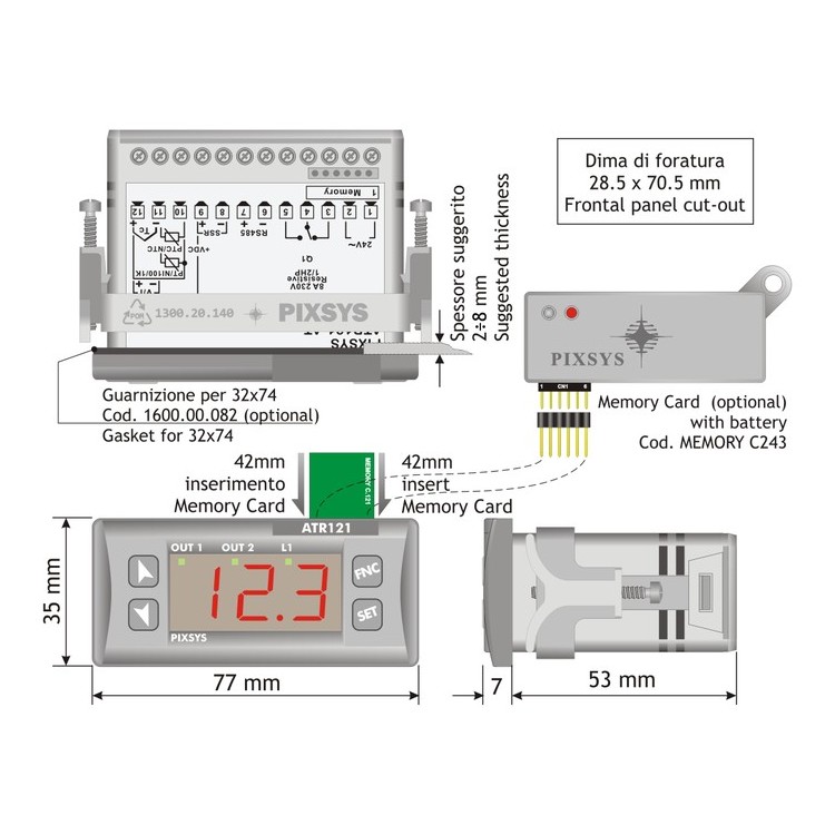 ATR121 Pixsys prikazovalnik in regulator CALEX z dvojno nastavljeno vrednostjo in 3-mestnim rdečim LED zaslonom. Vhod je nastavljiv za termočlene tipa J, K, S & R; Pt100; PTC1000; Ni100; NTC10k (običajno se uporablja v hladilni industriji); Pt500/Pt1000 (široko uporabljen v klimatskih napravah); 0 do 1 V; 0 do 10 V; 0 do 20 mA in 4 do 20 mA.