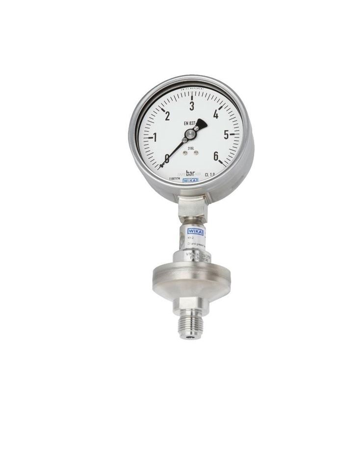 DSS34M manometer z nameščenim tlačnim vmesnikom (merilnik tlaka z nameščenim membranskim separatorjem) je zaščiten v aplikacijah z zahtevnimi mediji. Membrana iz nerjavečega jekla omogoča ločevanje merilnega instrumenta od medija. Tlak se prenaša na merilni instrument preko sistema polnilne tekočine, ki je znotraj sistema tlačnih vmesnikov.