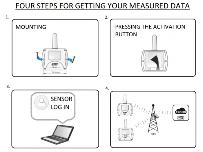 Izmerjene vrednosti se pošljejo v nastavljivem časovnem intervalu (10 min do 24 ur) z radijskim prenosom v omrežju Sigfox v oblak COMET, iz katerega si jih lahko uporabnik ogleda z osebnim računalnikom ali mobilno napravo.